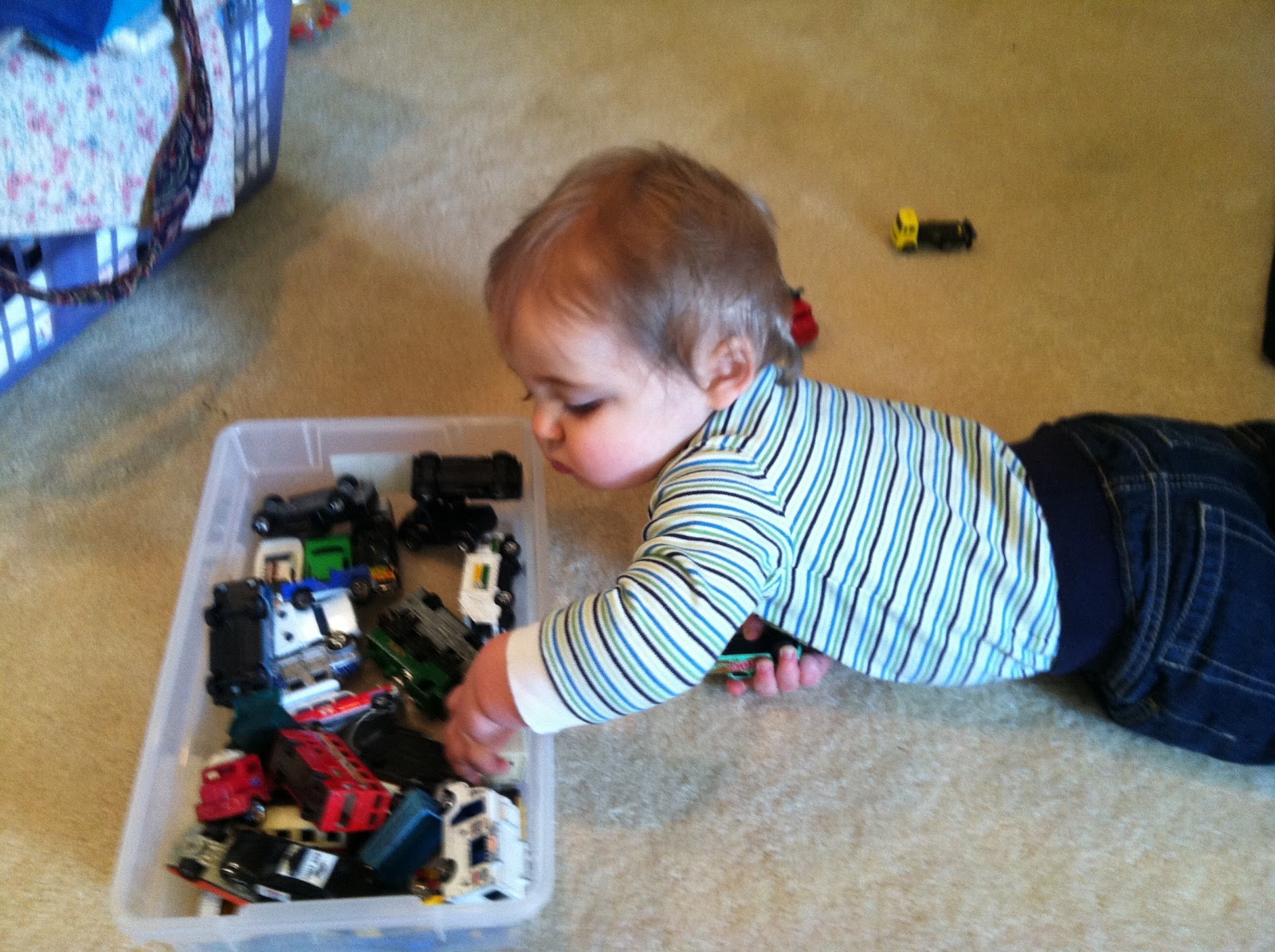 You love your brothers and if one of them is in the room your eyes are fixed on them. You love to play with James and think that he is absolutely hilarious. You are quick to join the fun no matter what he is playing, however he is not quite as excited to have you crawl over and start swatting at his neatly aligned rows of cars. Don't mess with James and his cars!
